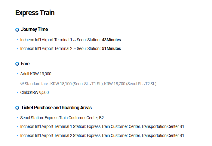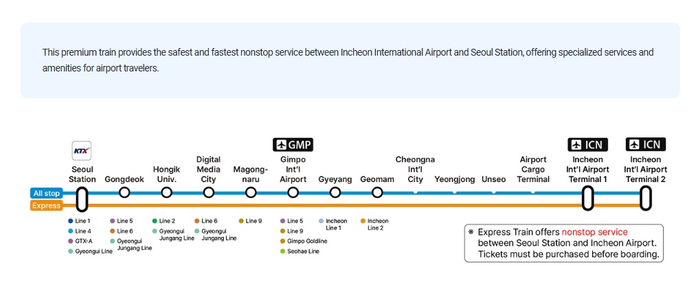 - The Express Train: Non-stop from ICN to Seoul Station. Takes about 43-51 minutes.